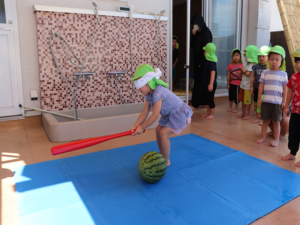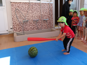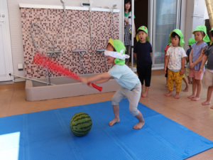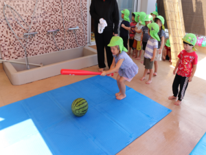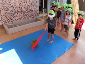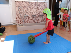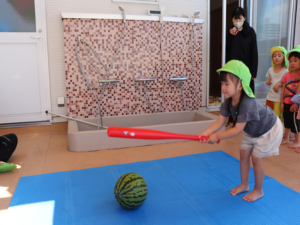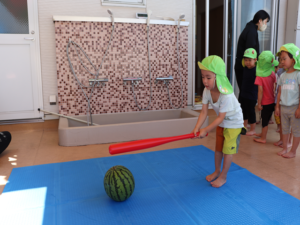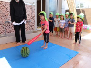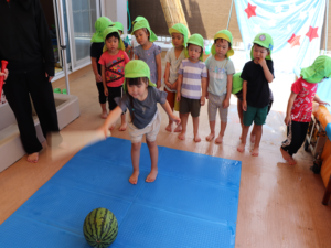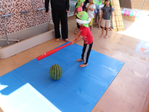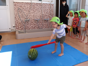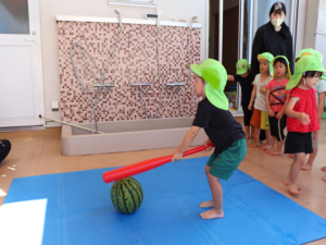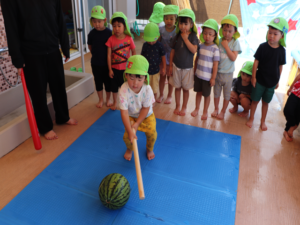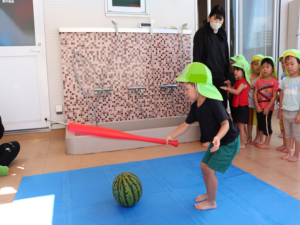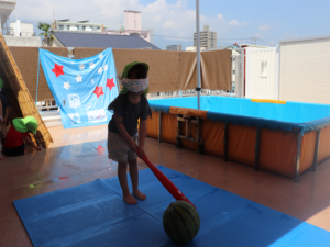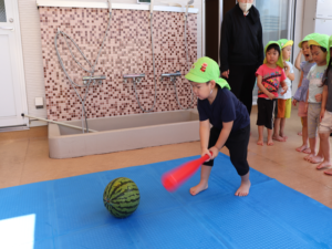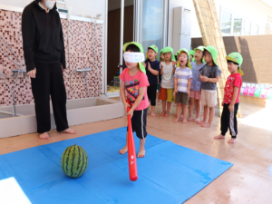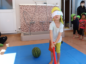 目隠しをして、みんなの声掛けを頼りにすいかをたたきます✨