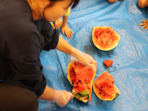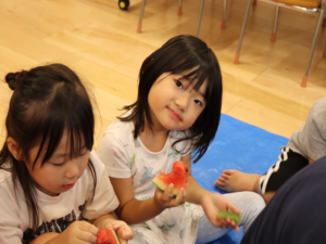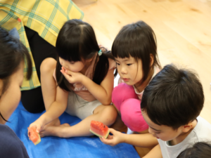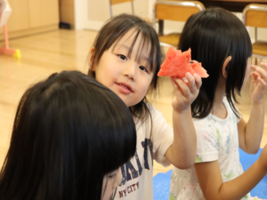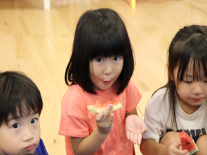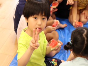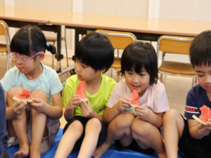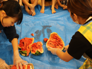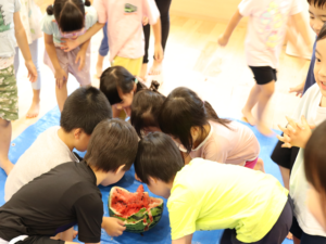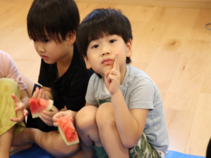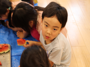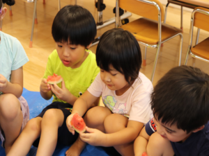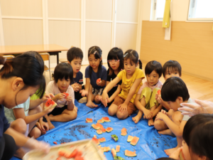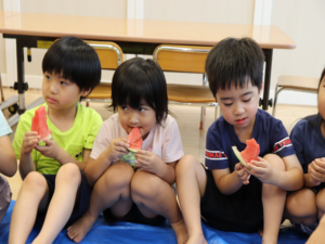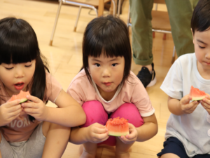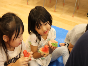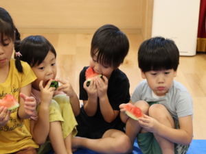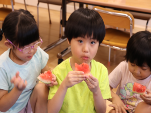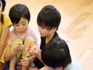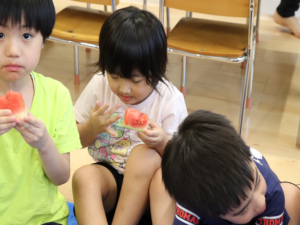 甘いすいかをみんなでパクパク…白いところまで食べようとするお友だちも🍉