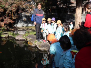 参拝後お庭の鯉を見る子供たちです🐟