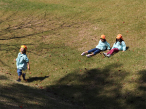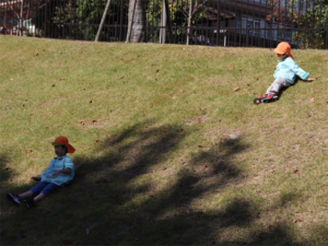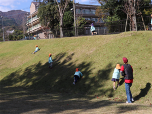 急な坂を元気に滑り降りる子供たちです✨