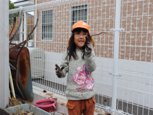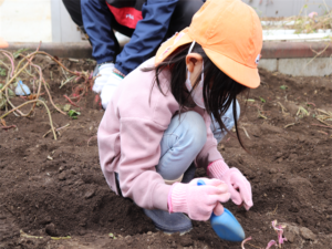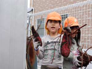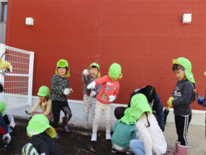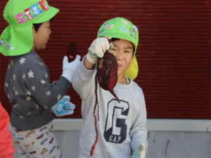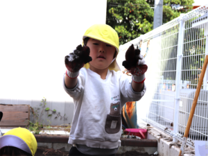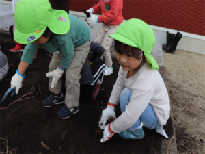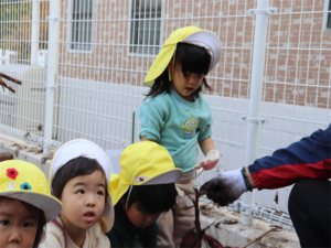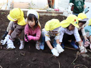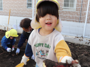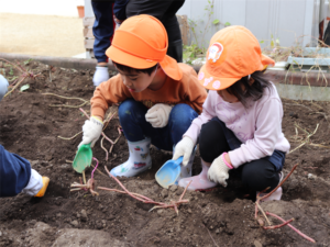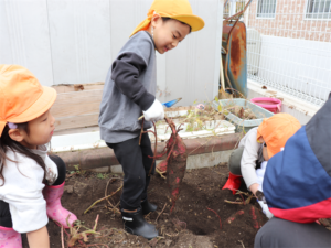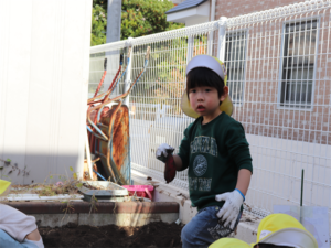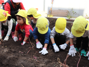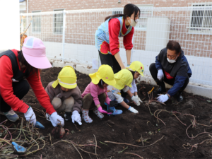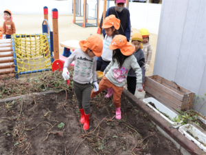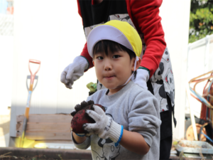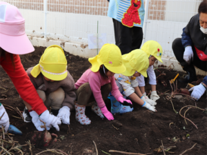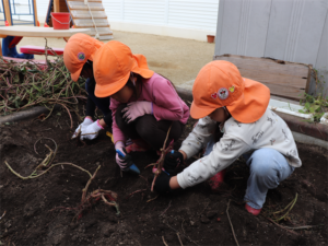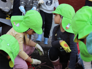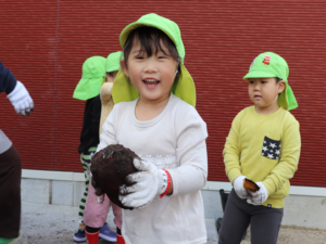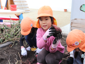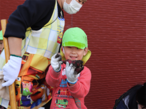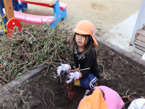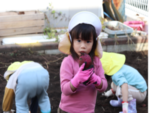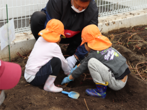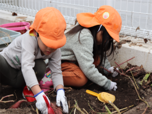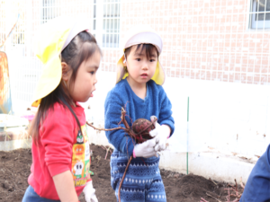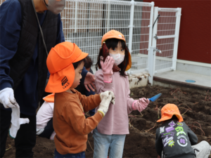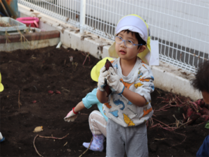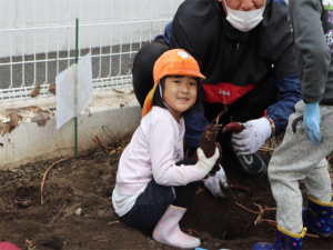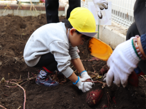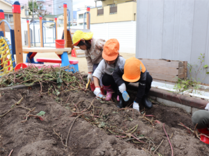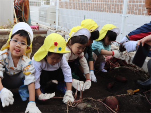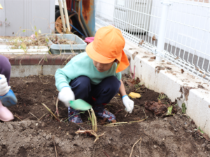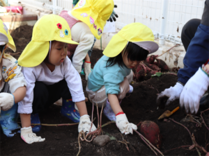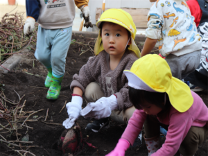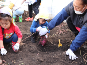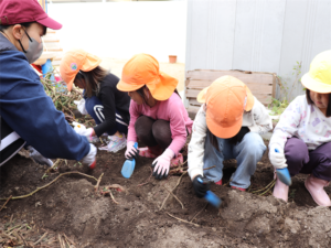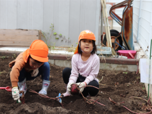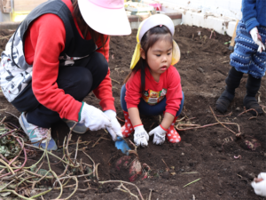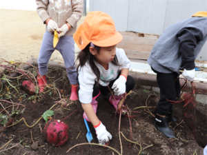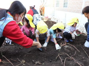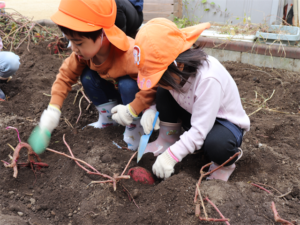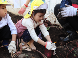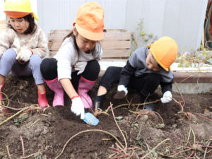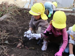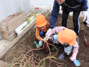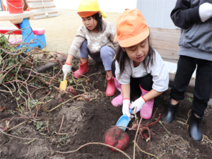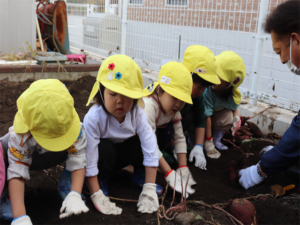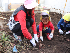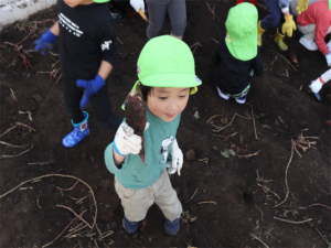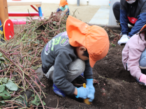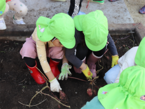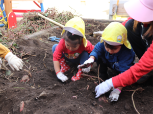 園長先生や担任の先生にも手伝ってもらいながらお芋を見つけます💕