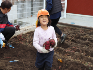 園長先生に手伝ってもらいながら大きいお芋を見つけます❗