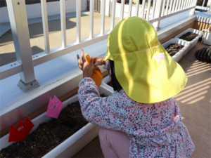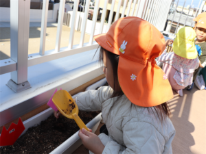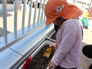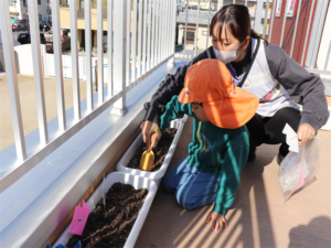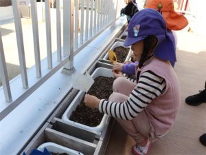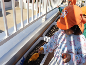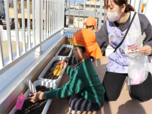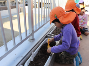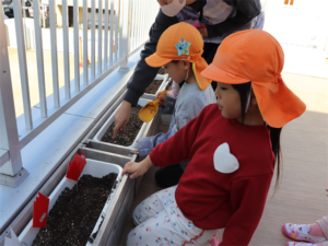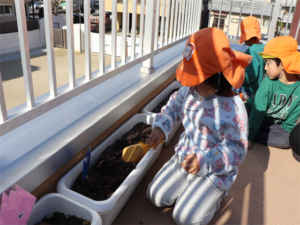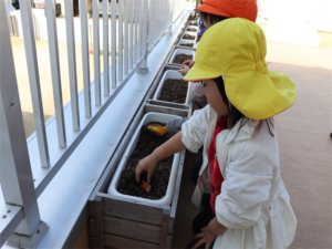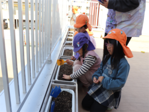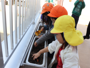ぞう・きりん組さんが冬の間、育ててくれるチューリップの球根の植え付けをしました✨