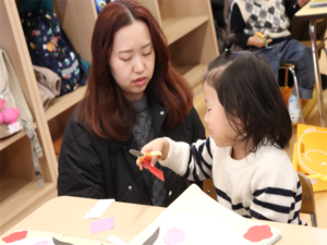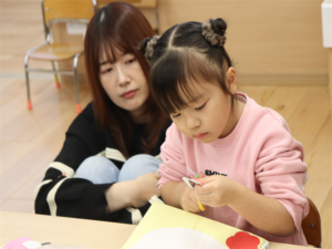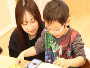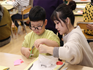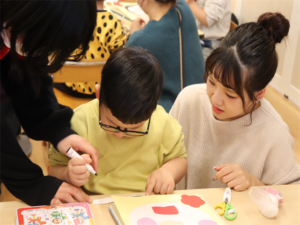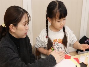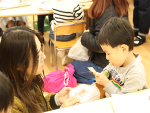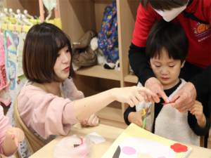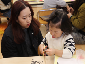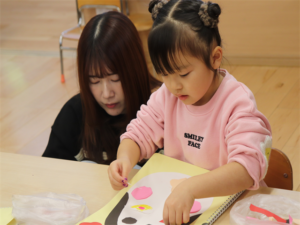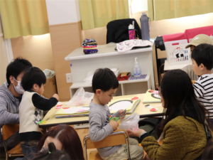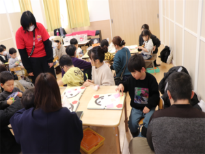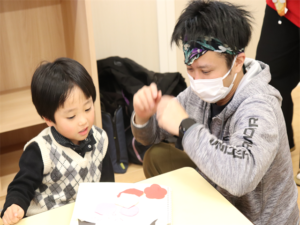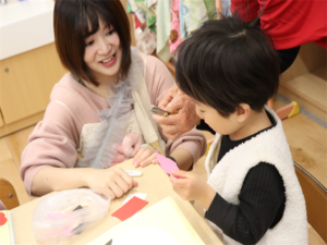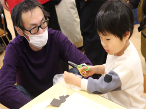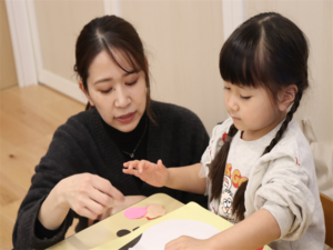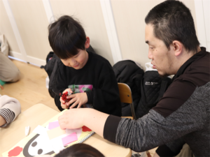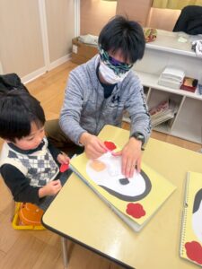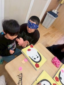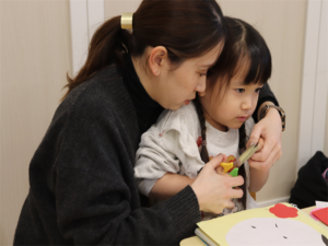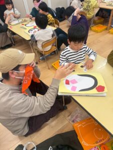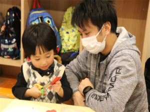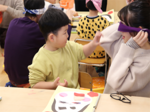ぱんだ組さんの参観日では、はさみを使って保護者の皆さんを一緒に福笑いの顔を作って、