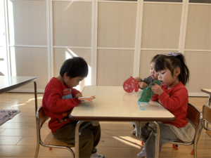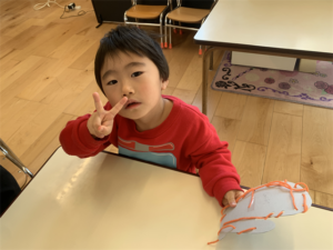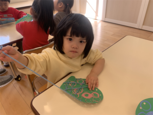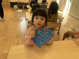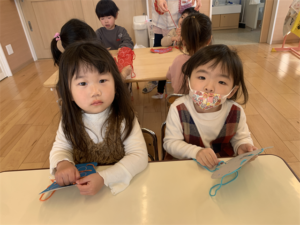 まず制作の様子…みんなで画用紙に色を付けたり、糸を使って製作しました💕