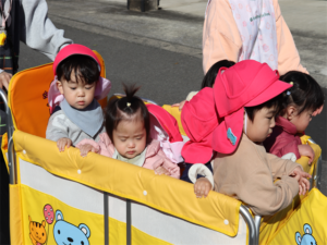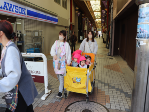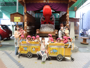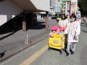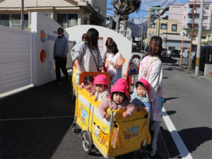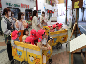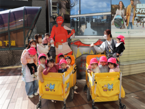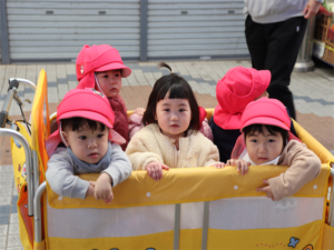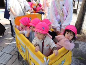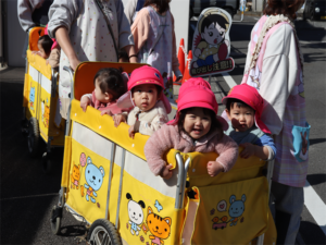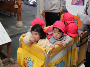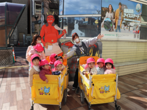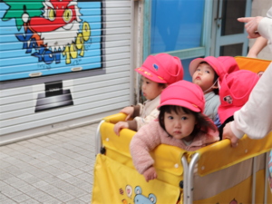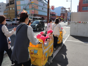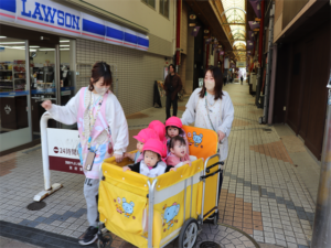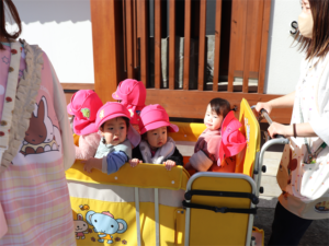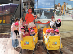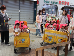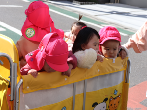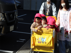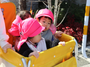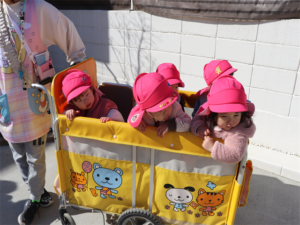 先生たちがお散歩車を押して子供たちの興味ある所に連れて行ってくれました♥️