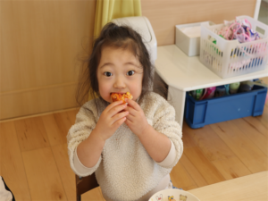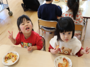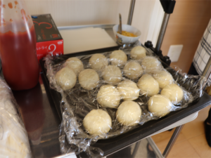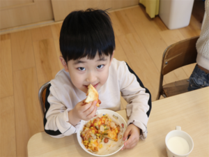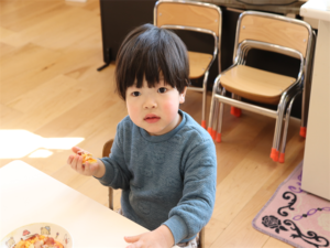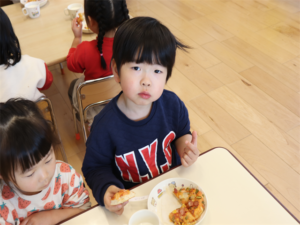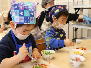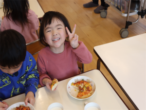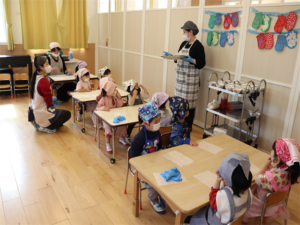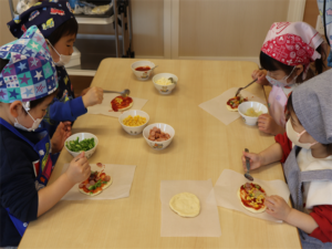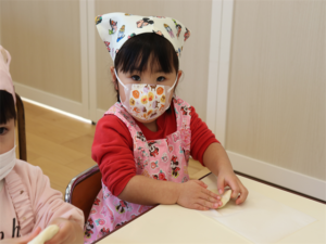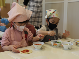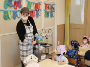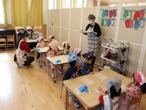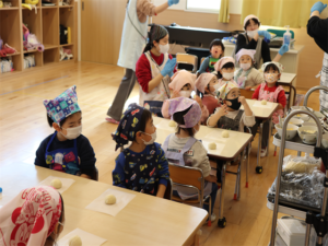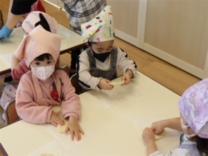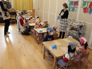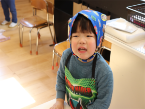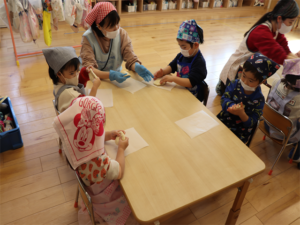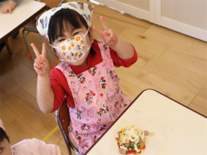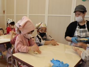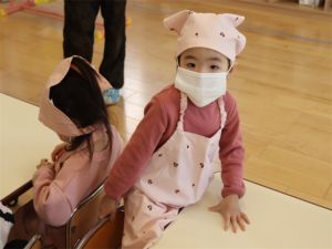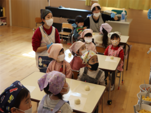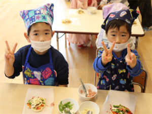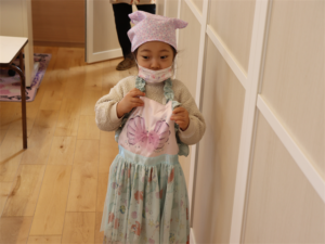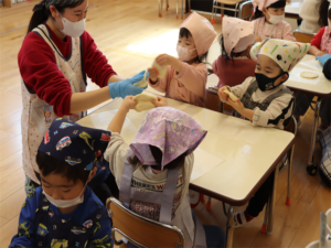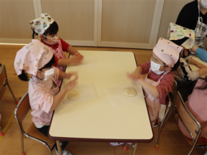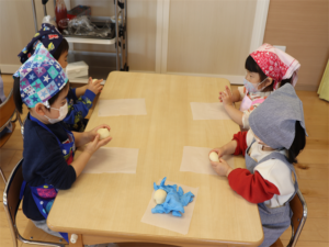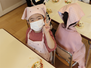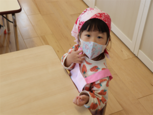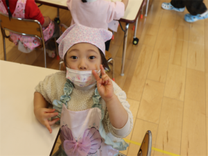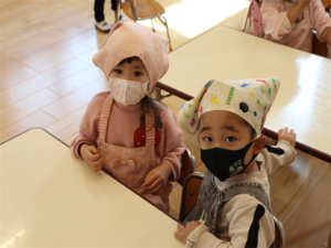 子供たち、エプロンと三角巾を付けて準備万端です😊