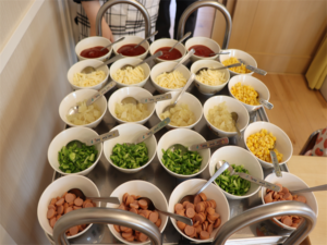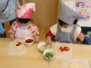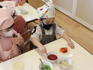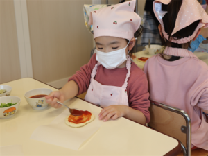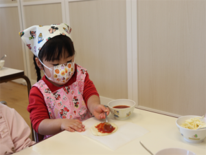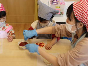 先生にお手伝いしてもらいながらトマトソースをぬっていきます♥️