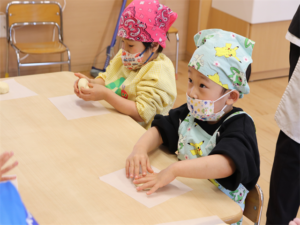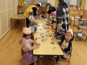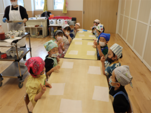 エプロンや三角巾、マスクをして準備万端な子供たちです✨