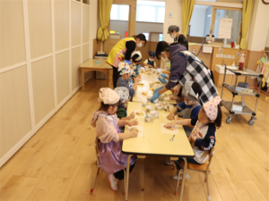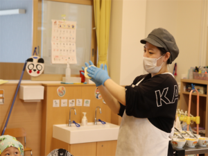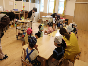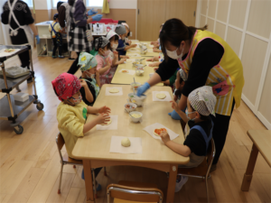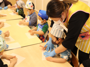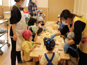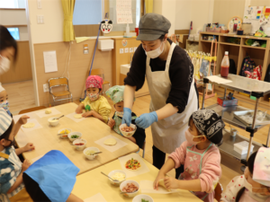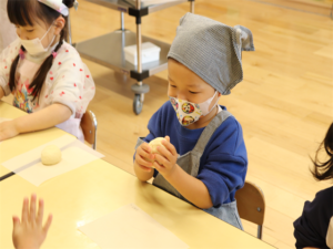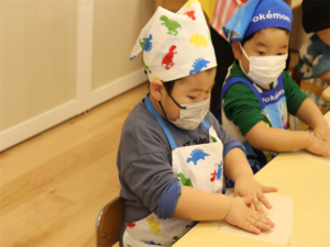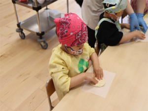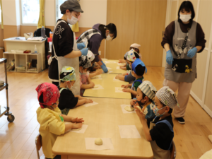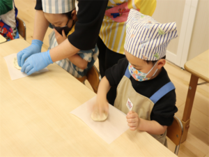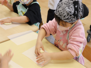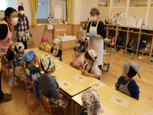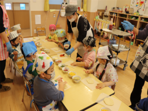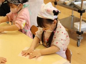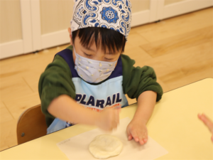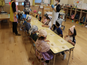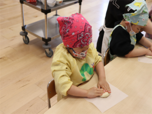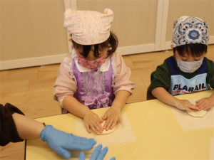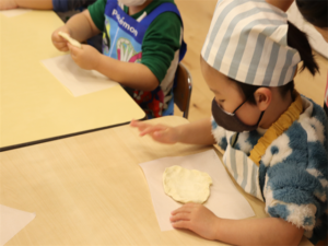 まず給食の先生が生地の伸ばし方を教えてくれました😊