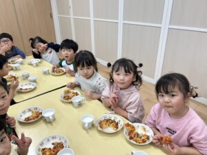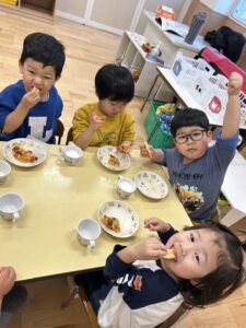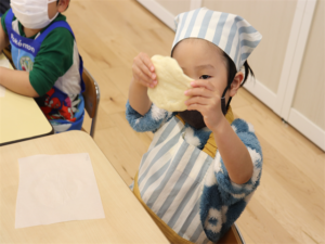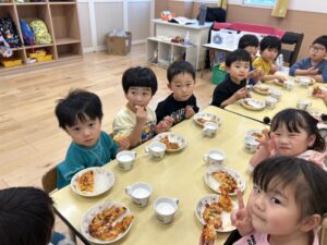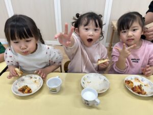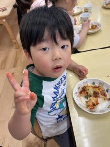 自分で作ったピザパンをおいしそうに食べる子供たちです👌