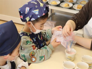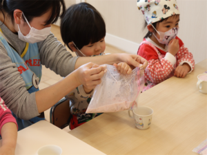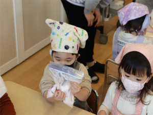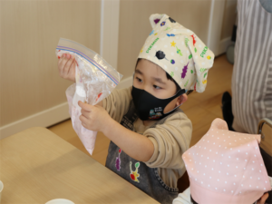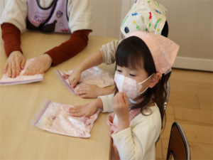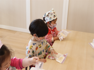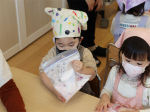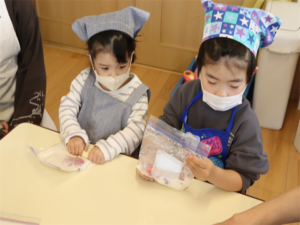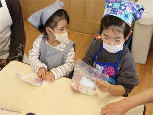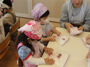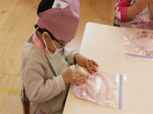 みんなでジップロックに入っているフルーツをつぶしていきます✨
