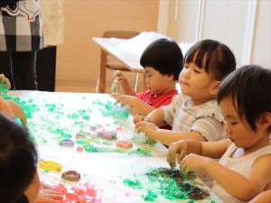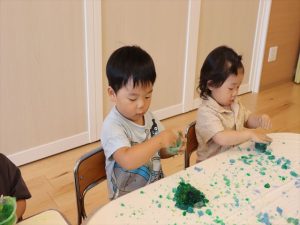 いろんな形に切ってみたり…綺麗な色合いを見て楽しんだりする子どもたちです。