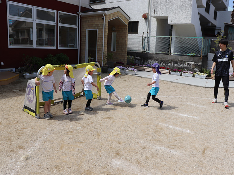 サッカーを通じて体を動かしたり、チームワークの大切さを学んでいきます。大分トリニータからスクールコーチが来て、子供たちに教えています。
